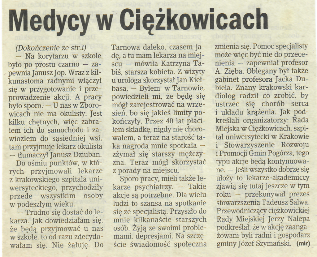 7 czerwca 20048 czerwca 2004 7 czerwca 2004 Medycy w Ciężkowicach, Gazeta Krakowska ( Tarnowska ), Nr. 132, Str. 1 i 2, 07.06.2004 r. Udostępnij0 Powiązane wpisy20 stycznia 2024Czytaj dalej2 sierpnia 2023Czytaj dalej2 sierpnia 2023Czytaj dalej21 lipca 2023Czytaj dalej21 maja 2022Czytaj dalej Dodaj komentarz Anuluj pisanie odpowiedziTwój adres e-mail nie zostanie opublikowany. Wymagane pola są oznaczone *Komentarz * Nazwa * Adres e-mail * Witryna internetowa Zapamiętaj moje dane w tej przeglądarce podczas pisania kolejnych komentarzy. Δ