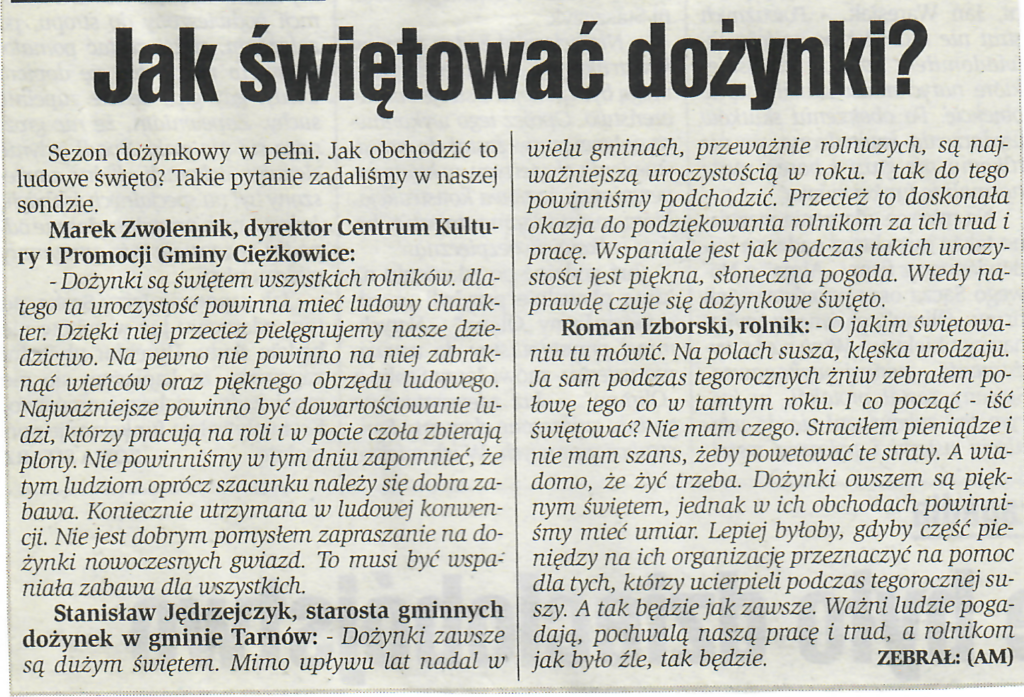 20 sierpnia 200325 sierpnia 2003 22 sierpnia 2003 Jak świętować dożynki?, Dziennik Polski ( Tarnowski), Nr. 195, Str. 2, 22.08.2003 r. Udostępnij0 Powiązane wpisy20 stycznia 2024Czytaj dalej2 sierpnia 2023Czytaj dalej2 sierpnia 2023Czytaj dalej21 lipca 2023Czytaj dalej21 maja 2022Czytaj dalej Dodaj komentarz Anuluj pisanie odpowiedziTwój adres e-mail nie zostanie opublikowany. Wymagane pola są oznaczone *Komentarz * Nazwa * Adres e-mail * Witryna internetowa Zapamiętaj moje dane w tej przeglądarce podczas pisania kolejnych komentarzy. Δ