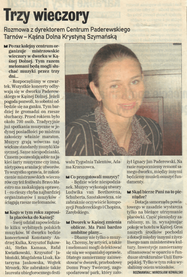 22 sierpnia 200526 sierpnia 2005 26 sierpnia 2005 Trzy wieczory, Gazeta Krakowska, Nr. 198, Str. 7, 26.08.2005 r. Udostępnij0 Powiązane wpisy20 stycznia 2024Czytaj dalej2 sierpnia 2023Czytaj dalej2 sierpnia 2023Czytaj dalej21 lipca 2023Czytaj dalej21 maja 2022Czytaj dalej Dodaj komentarz Anuluj pisanie odpowiedziTwój adres e-mail nie zostanie opublikowany. Wymagane pola są oznaczone *Komentarz * Nazwa * Adres e-mail * Witryna internetowa Zapamiętaj moje dane w tej przeglądarce podczas pisania kolejnych komentarzy. Δ