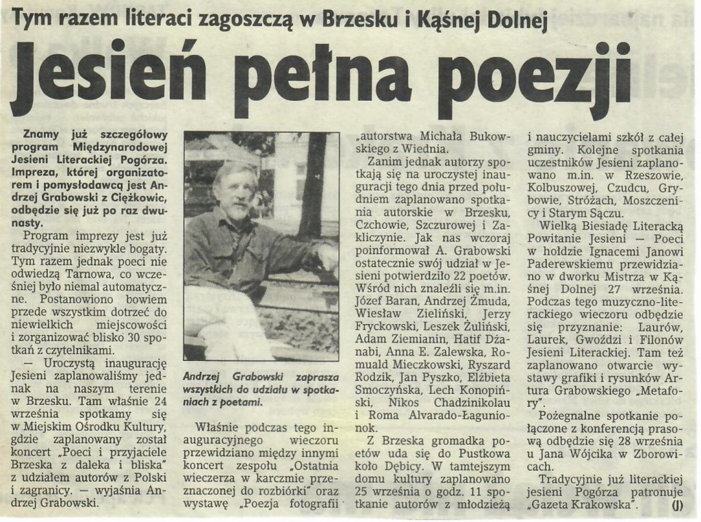 9 września 200219 września 2002 12 września 2002 Jesień pełna poezji Gazeta Krakowska ( Tarnowska ), Nr. 213, Str.4, 12.09.2002 r. Udostępnij0 Powiązane wpisy20 stycznia 2024Czytaj dalej2 sierpnia 2023Czytaj dalej2 sierpnia 2023Czytaj dalej21 lipca 2023Czytaj dalej21 maja 2022Czytaj dalej Dodaj komentarz Anuluj pisanie odpowiedziTwój adres e-mail nie zostanie opublikowany. Wymagane pola są oznaczone *Komentarz * Nazwa * Adres e-mail * Witryna internetowa Zapamiętaj moje dane w tej przeglądarce podczas pisania kolejnych komentarzy. Δ