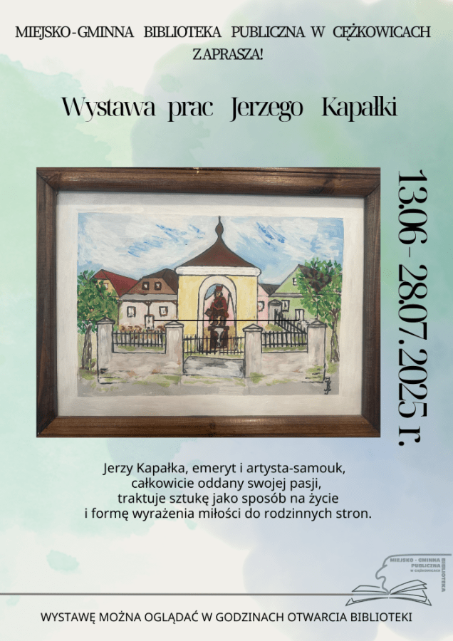 17 czerwca 2025Serdecznie zapraszamy do obejrzenia wystawy prac autorstwa Jerzego Kapałki – mieszkańca Ciężkowic, pasjonata sztuki, malarza i rzeźbiarza. To już trzecia z kolei ekspozycja jego twórczości prezentowana w naszej bibliotece, ukazująca piękno Ciężkowic.