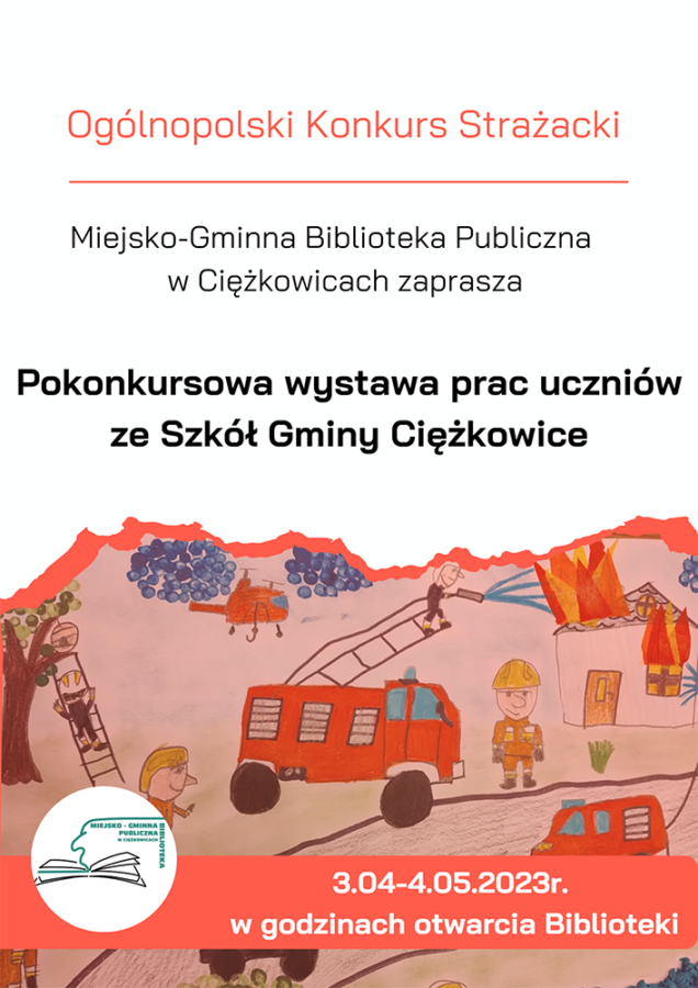 3 kwietnia 2023Serdecznie zapraszamy do Biblioteki w Ciężkowicach, od dzisiaj do 4 maja br. można podziwiać pokonkursową wystawę prac w ramach Ogólnopolskiego Strażackiego Konkursu Plastycznego. Na etapie gminnym z pośród 100 prac plastycznych z przedszkoli i szkół podstawowych z terenu gminy Ciężkowice do etapu powiatowego zakwalifikowało się 15 prac plastycznych w 3 grupach wiekowych.