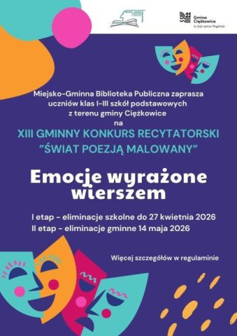 16 marca 2026Zapraszamy uczniów klas I–III szkół podstawowych z terenu Gminy Ciężkowice do udziału w XIII Gminnym Konkursie Recytatorskim „Świat poezją malowany”, który w tym roku odbywa się pod hasłem „Emocje wyrażone wierszem”.
